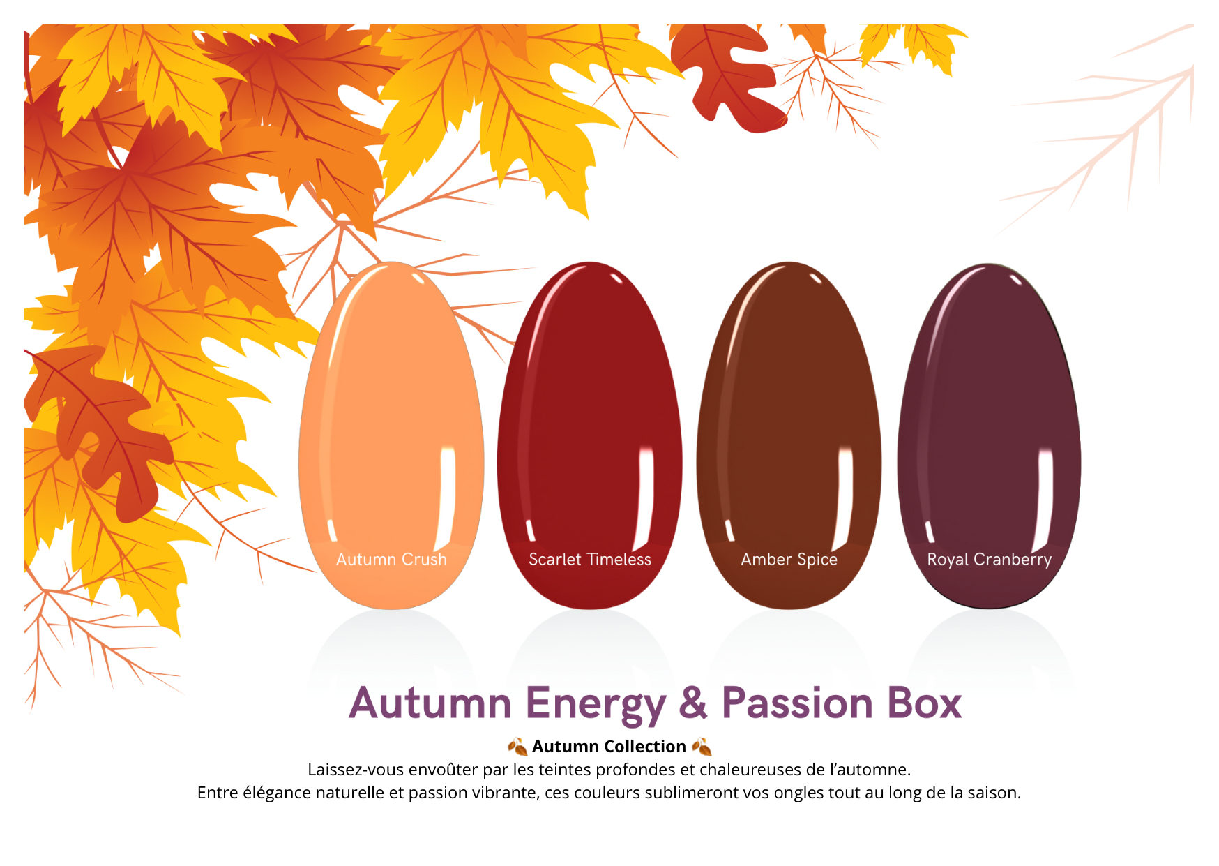 • Autumn Crush : un orange doux et lumineux qui capture la chaleur des feuilles d’automne.